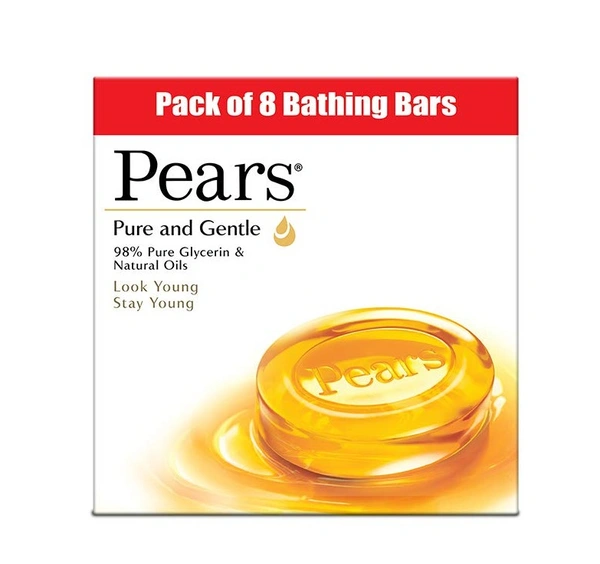 Pears Pure & Gentle Soap Bar (Combo Pack of 8) - With Glycerin for Soft, Glowing Skin & Body, Paraben-Free Body Soaps For Bath Ideal for Men & Women